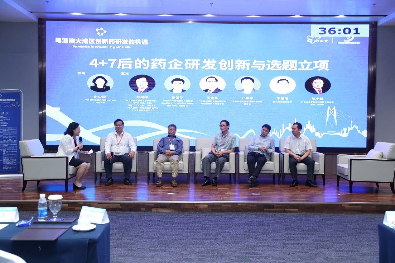 4+7后的藥企研發(fā)創(chuàng)新與選題立項》為主題的圓桌討論環(huán)節(jié),由廣東省生物醫(yī)藥創(chuàng)新技術(shù)協(xié)會朱少璇會長主持,由南方科技大學理學院院長張緒穆教授、廣州市恒諾康醫(yī)藥科技有限公司董事長張健存博士、廣州博濟醫(yī)藥生物有限公司副總經(jīng)理兼首席運營官王建華博士、深圳市華先醫(yī)藥科技有限公司董事長葉偉平博士和國藥致君副總經(jīng)理陳振陽先生作為討論嘉賓。各位嘉賓圍繞該主題闡明了4+7對自身所處的產(chǎn)業(yè)鏈不同環(huán)節(jié)的影響和啟發(fā),為創(chuàng)新藥企業(yè)選題立項提供了參考。