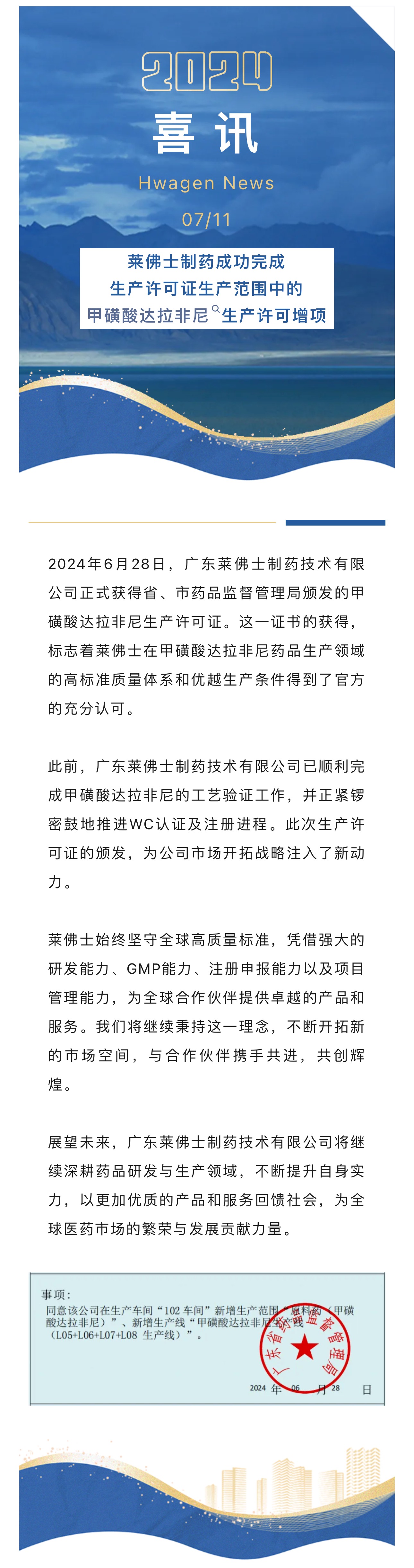 喜訊丨萊佛士制藥成功完成生產(chǎn)許可證生產(chǎn)范圍中的甲磺酸達(dá)拉非尼生產(chǎn)許可增項(xiàng)目